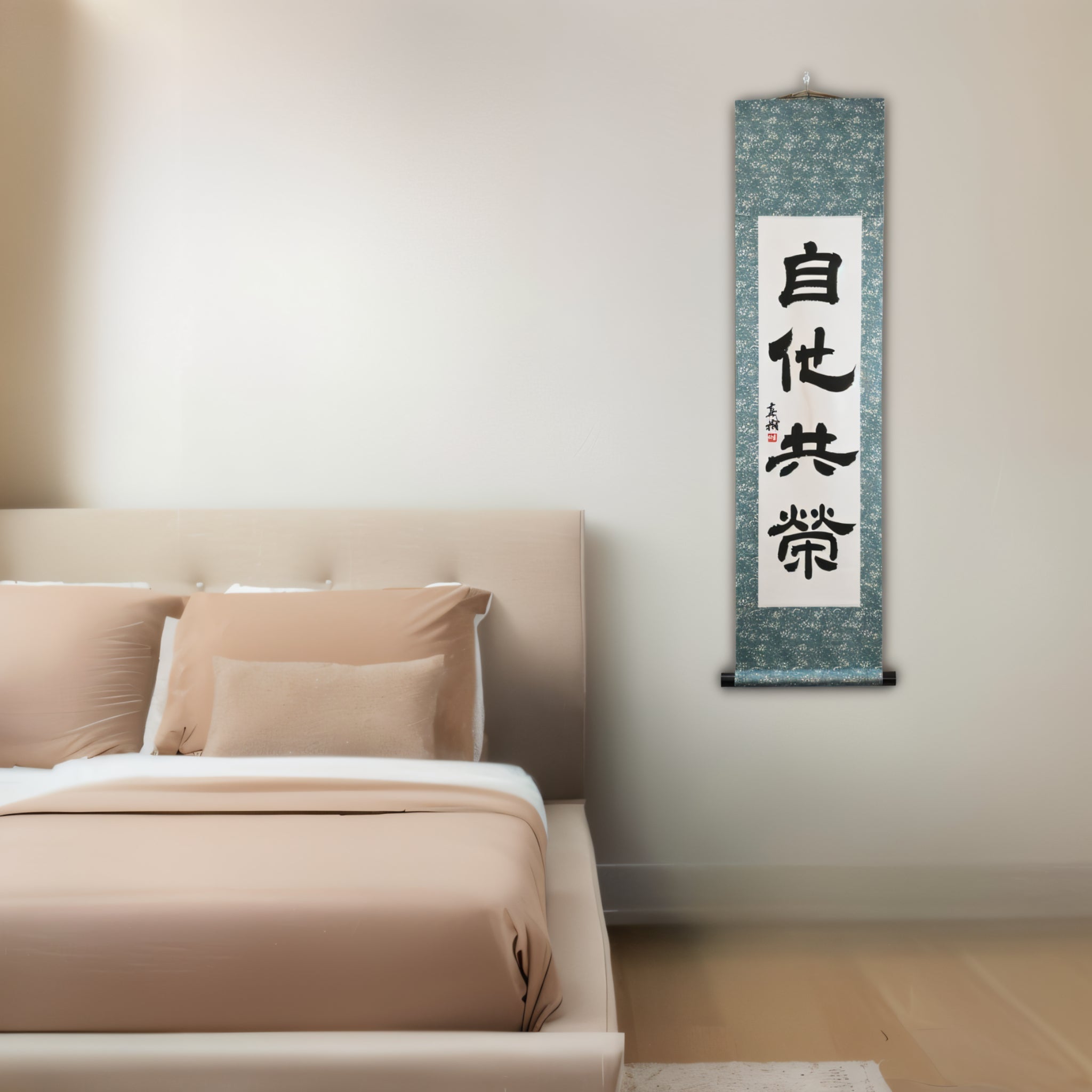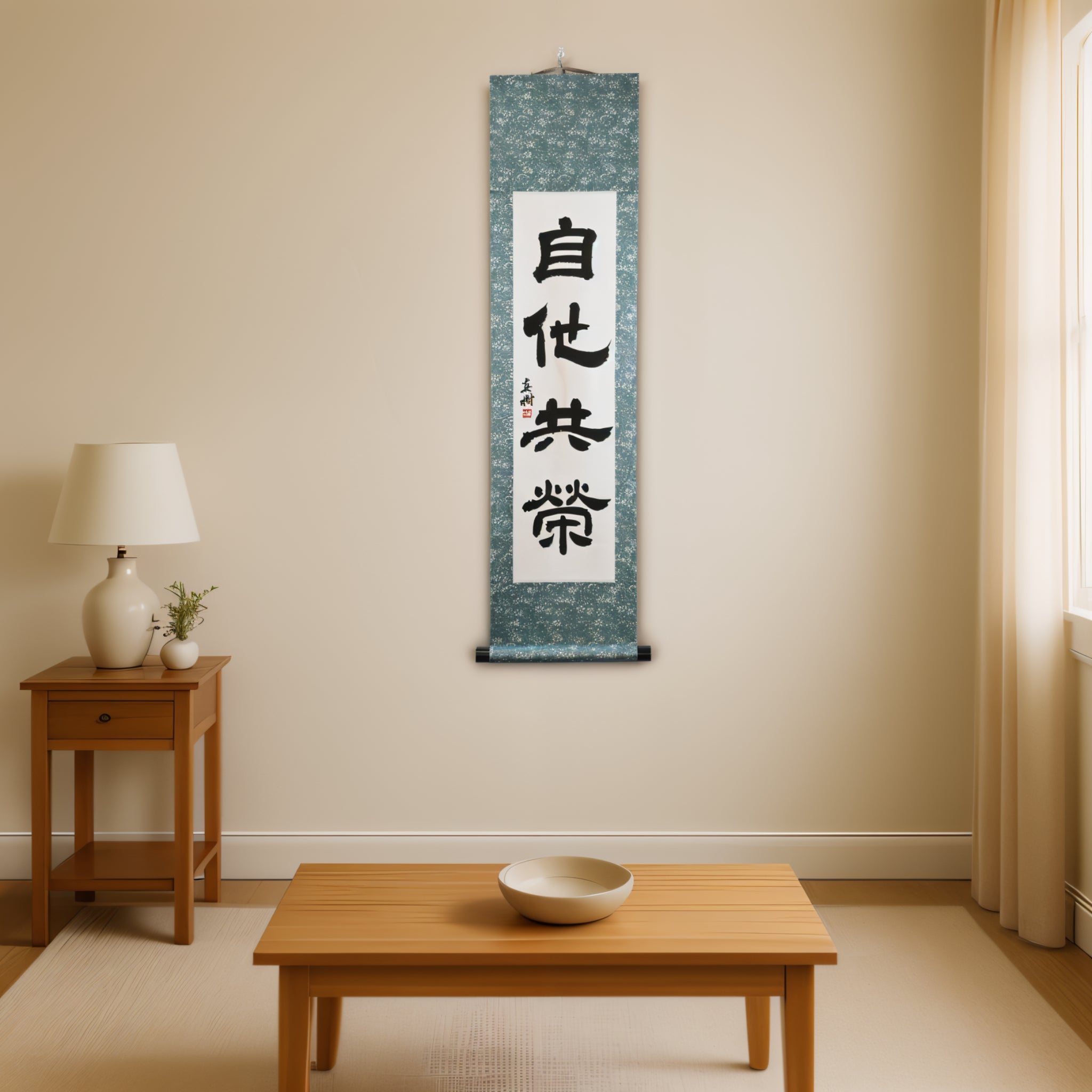 Note: This scroll is written in the traditional Reisho (clerical script) — an ancient calligraphic style known for its quiet elegance and contemplative depth. Its balanced strokes and calm rhythm enhance the serene character of "Jita-Kyōei", giving the piece a timeless, Zen-inspired presence in any interior.