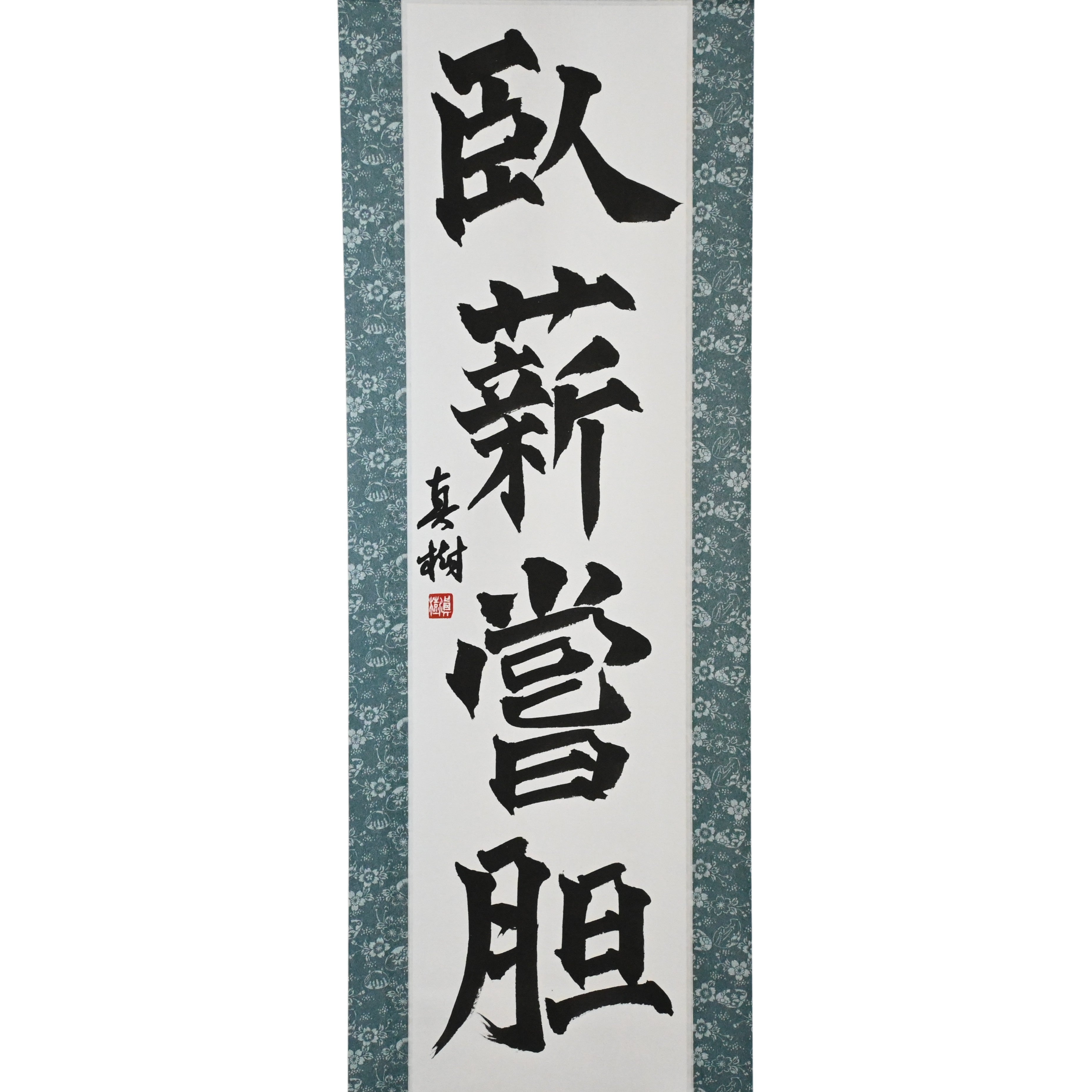 Ce rouleau de calligraphie japonaise présente la puissante phrase 臥薪嘗胆 (Gashin Shōtan) — une expression intemporelle de patience, de persévérance et de détermination silencieuse sur le chemin du samouraï.