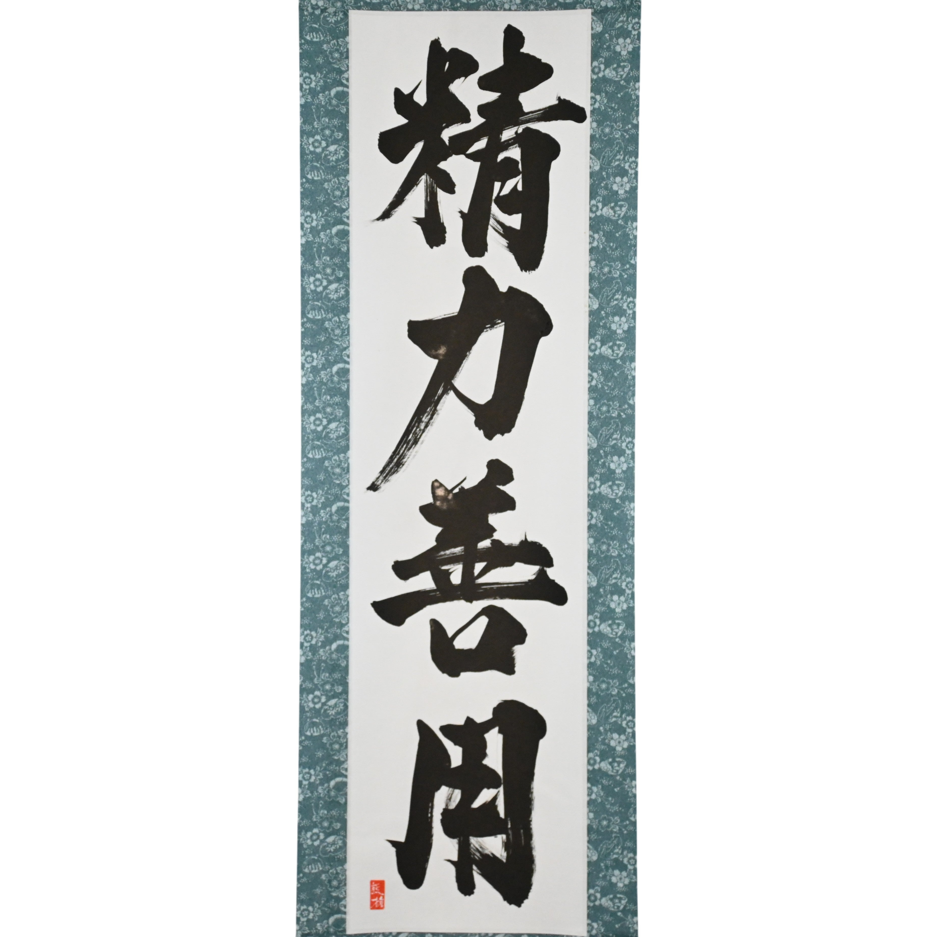 Ce rouleau de calligraphie japonaise présente la phrase intemporelle 精力善用 (Seiryoku-Zenyō) — traduite par « Utilisation maximale et efficace de l'énergie ». C'est l'un des deux principes fondamentaux du Judo, aux côtés de 自他共栄 (Jita-Kyōei, « Bien-être mutuel et bénéfice »), tous deux établis par le fondateur du Judo, Jigoro Kano (嘉納治五郎).